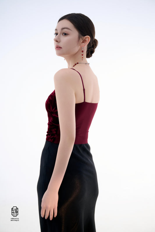 The deep red velvet camisole boasts a soft, sumptuous texture and intricate botanical motifs, exuding understated luxury, elegance, and a hint of mystery. Its lightweight straps and perfect cut not only serve as a striking standalone piece but also enhance any outfit when layered, adding style and allure to various occasions.