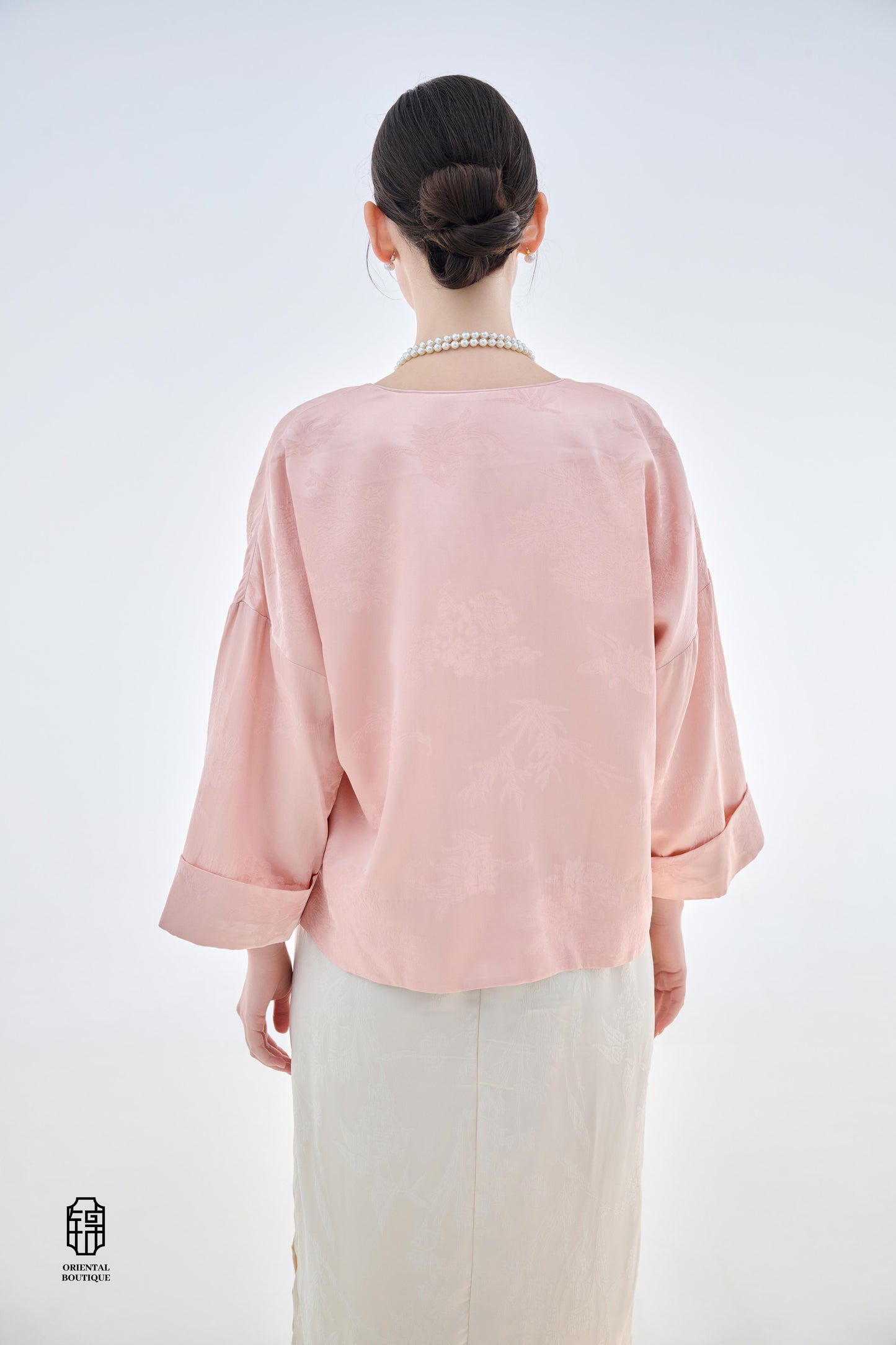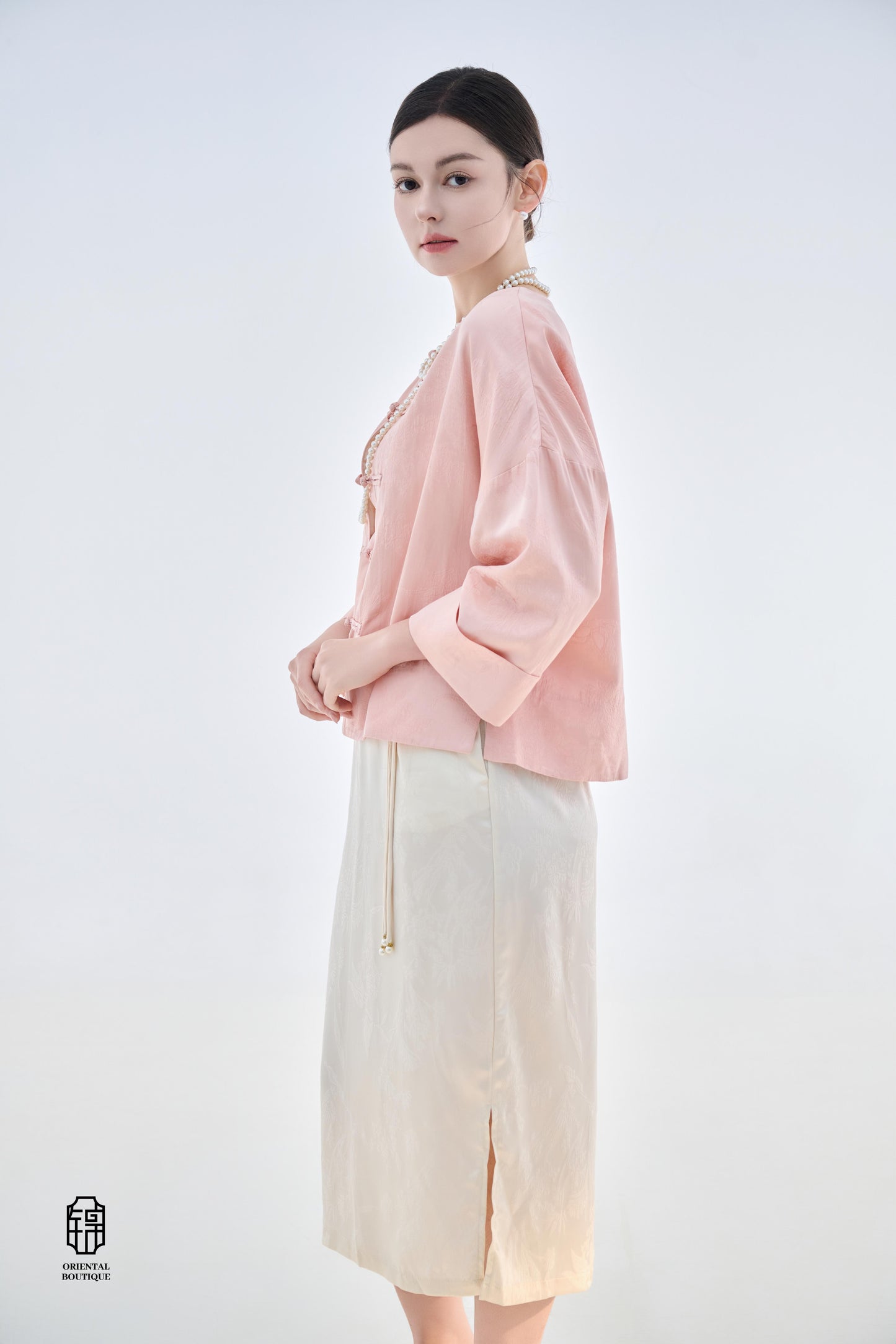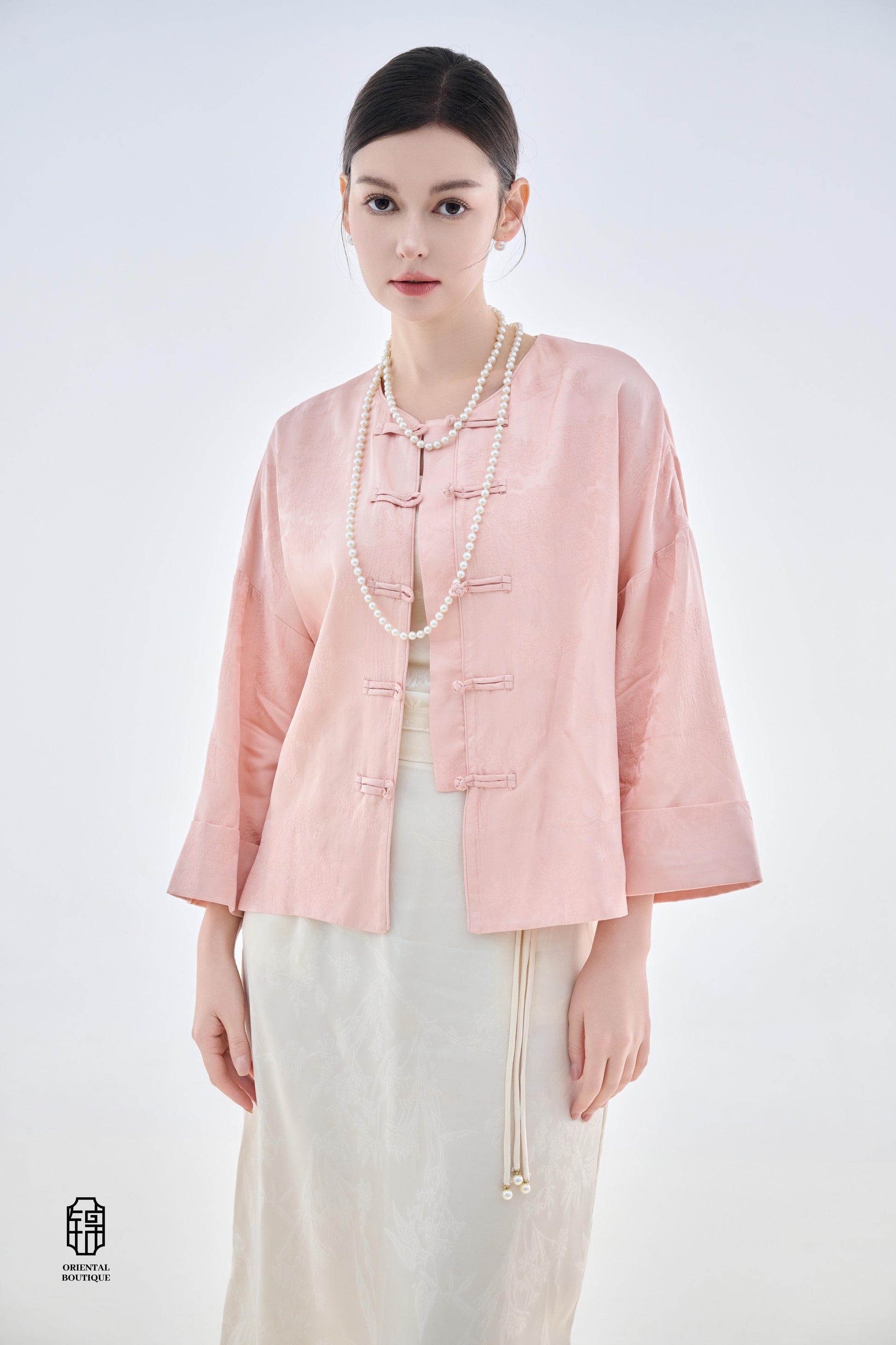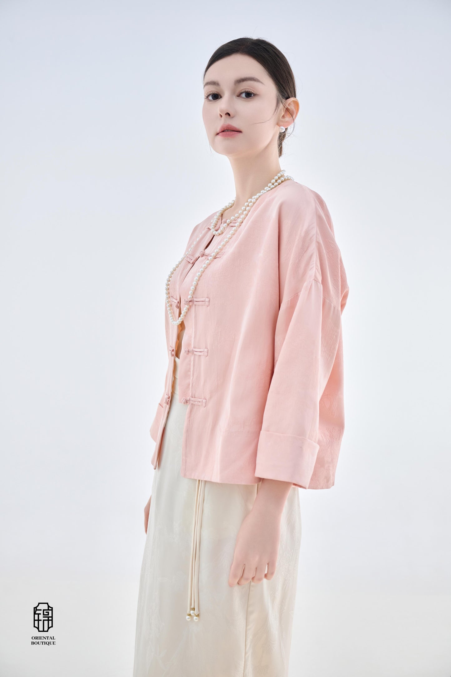 The Dawn Pink Brocade Jacket is crafted from soft pink silk fabric, offering an elegant and graceful design that exudes a gentle charm. The jacket features subtle brocade patterns on the surface, adding an understated yet refined touch. The frog button closures reflect traditional Chinese elements, while the loose fit ensures comfort. The slightly rolled sleeves add a playful accent, making this jacket suitable for both everyday wear and formal occasions, showcasing a woman’s elegance and femininity.