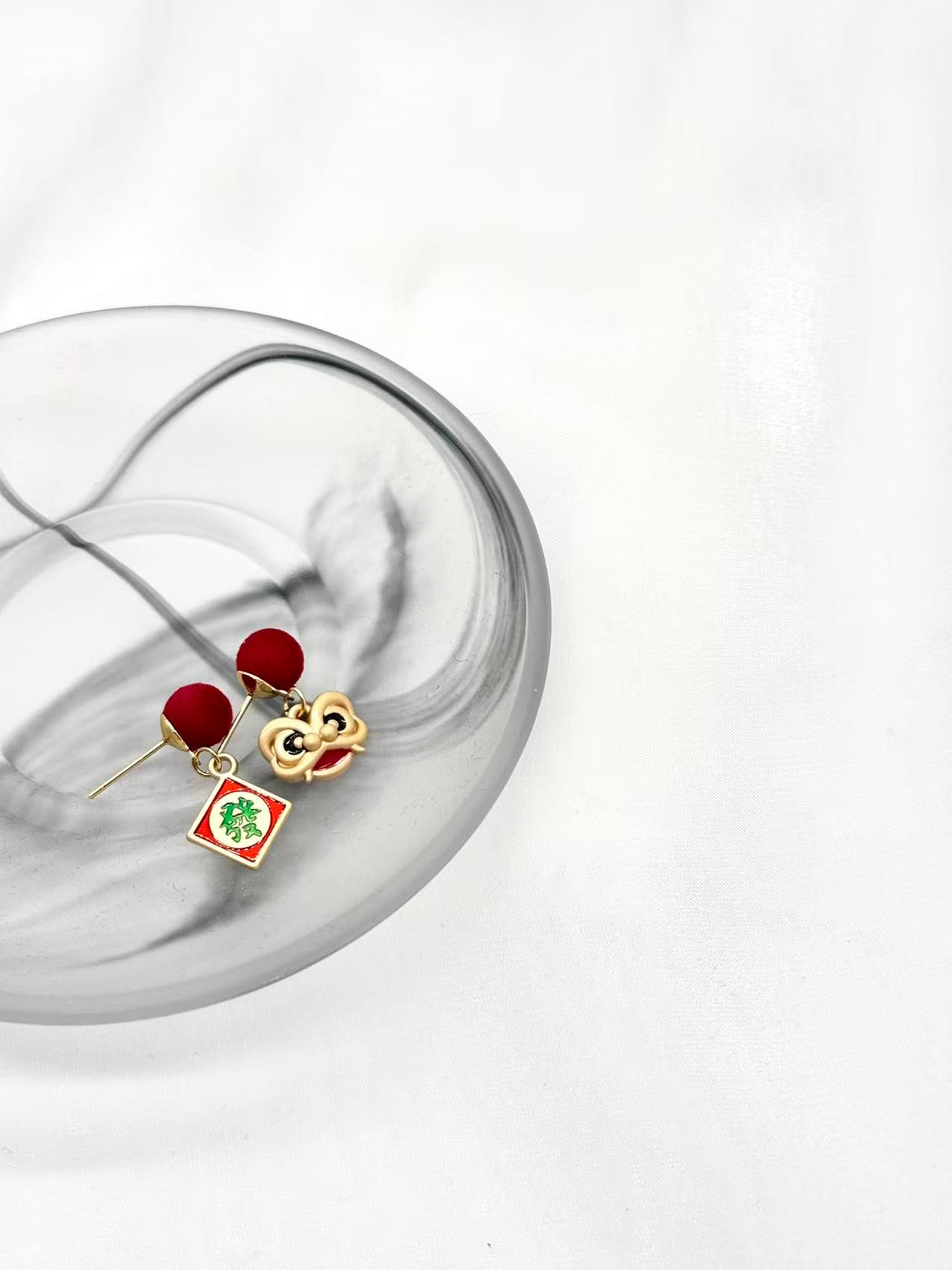Lucky “Fa Cai” & Lion Dance Mismatch Earrings – Red Velvet Ball