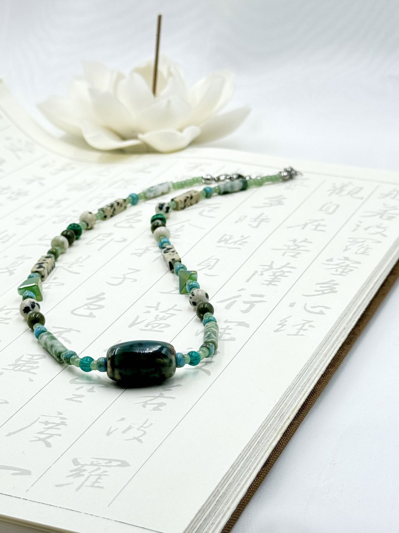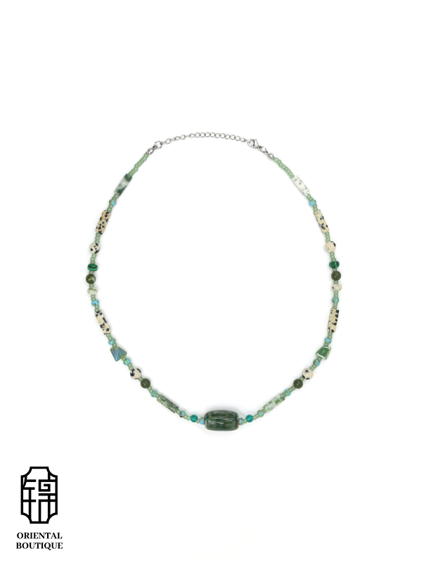The Emerald Mist Necklace features a medley of green gemstones, evoking the vibrant and rhythmic essence of a lush forest. Crafted with a variety of shapes and textures, it combines jade beads, teal stones, and spotted natural stones, resembling mist drifting through an ancient grove. The necklace’s harmonious blend of colors and materials creates a unique, layered design, ideal for nature lovers and those who appreciate distinctive style.
