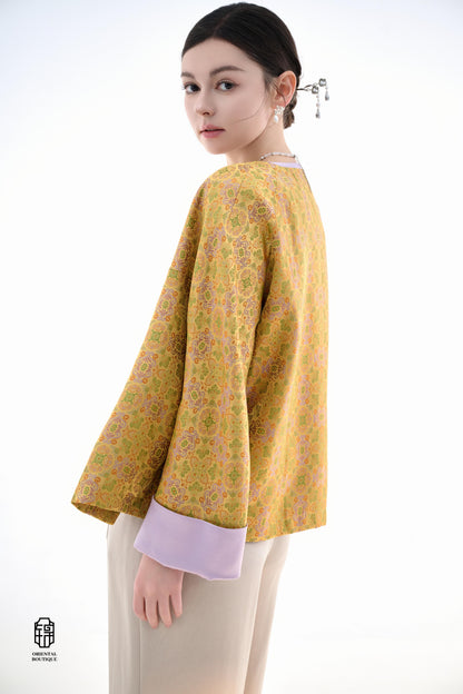 紫金锦缎外套以金黄色为主调,点缀着精美的花卉图案,整体设计充满了东方古典美感。外套的领口、袖口和盘扣使用淡紫色进行装饰,形成了一种清新雅致的对比,增添了几分柔美与灵动。宽松的剪裁不仅舒适,同时展现出优雅的轮廓,适合在多种场合中穿着,能够轻松搭配出时尚且高贵的造型。