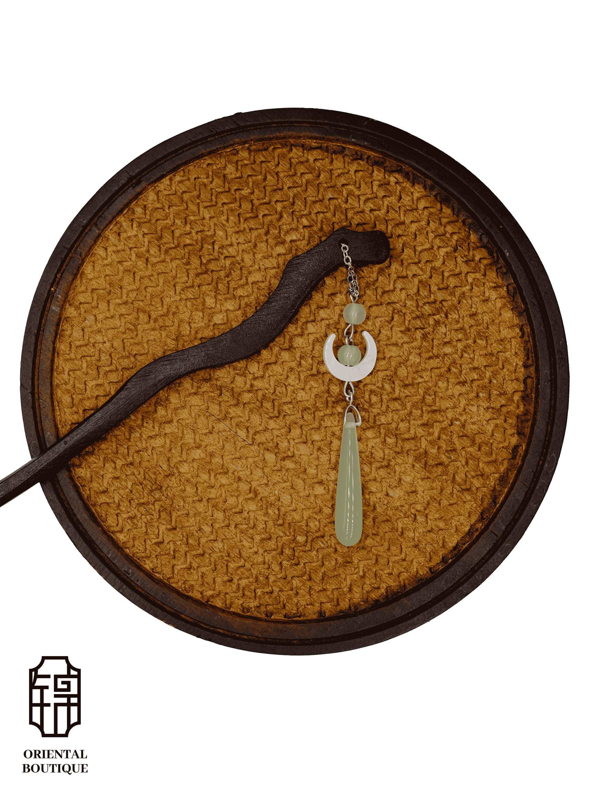 This hairpin features a dark wooden base decorated with light green beads, a crescent-shaped charm, and a long teardrop-shaped drop pendant. The design is simple and elegant, giving a natural and refreshing look suitable for daily wear or photoshoots.