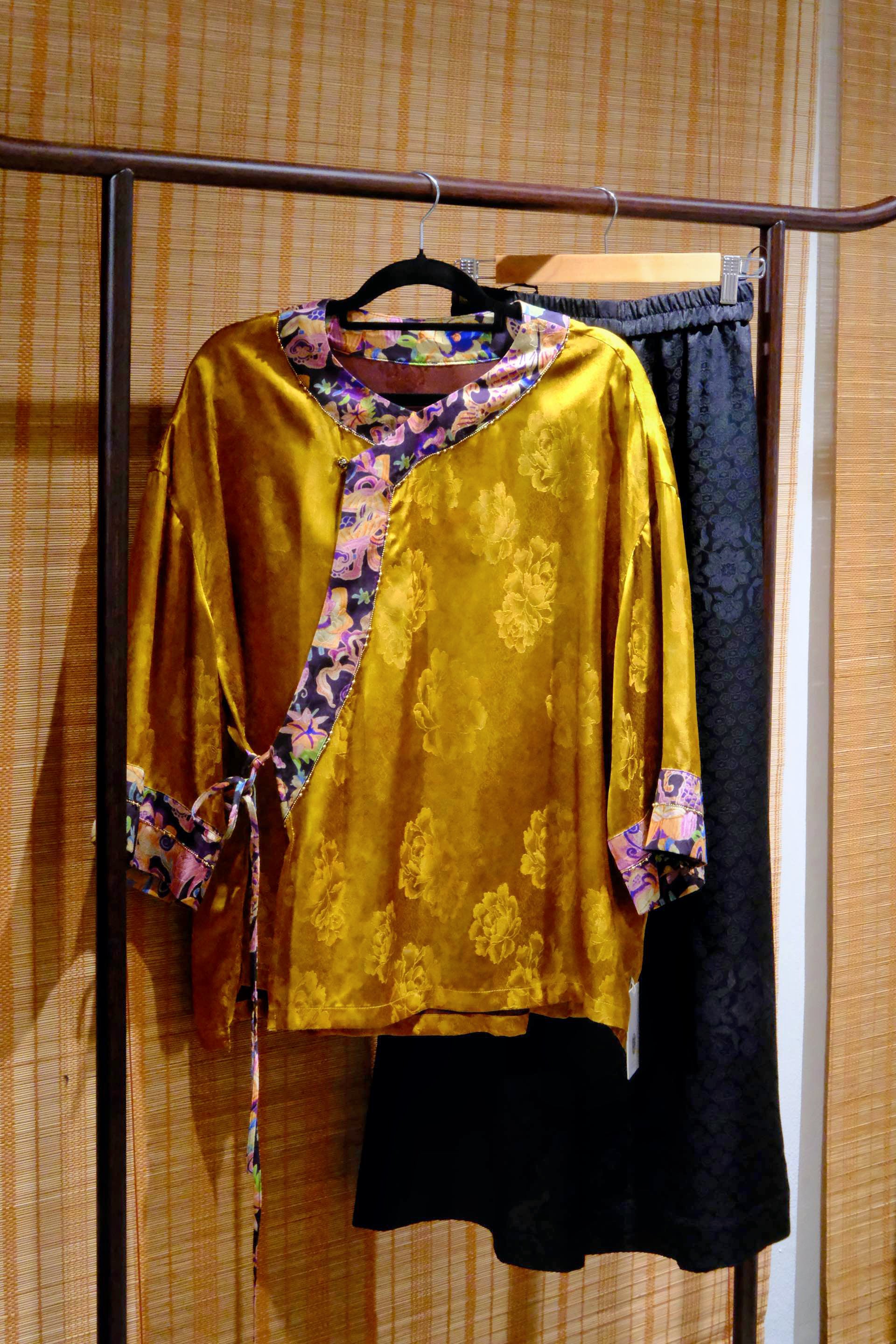 This unique blouse is crafted from soft jacquard rayon, featuring a rich golden tone with subtle floral textures. The standout detail lies in its contrasting printed trim—a beautiful blend of purple and multicolour florals that brings an artistic, modern New Chinese character to the design.