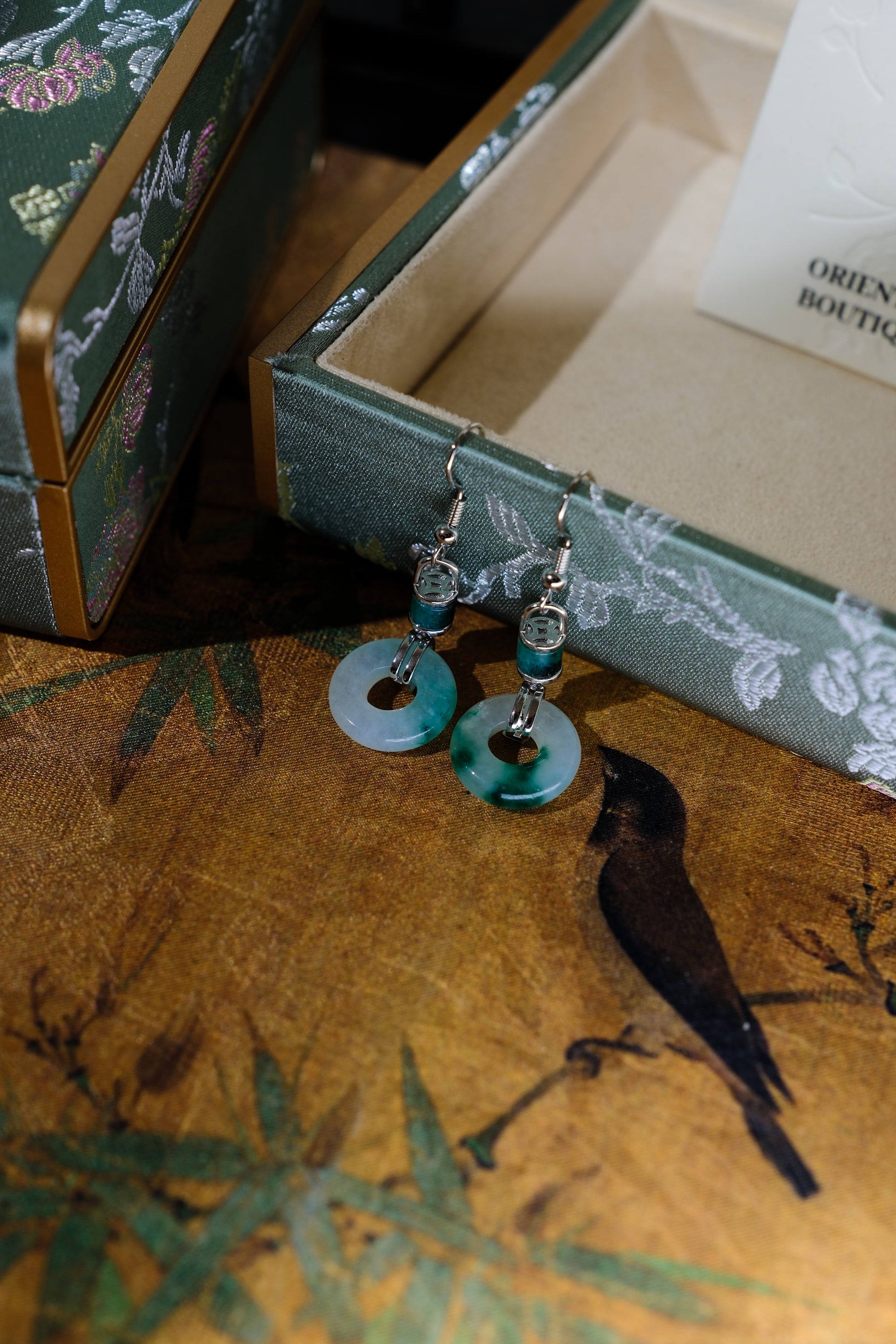 These earrings feature smooth green jade hoops complemented by silver accents, embodying a refined and elegant Eastern charm. The jade loops symbolize good fortune and longevity, while the silver clasp details add a modern touch of sophistication. The overall design is sleek and fresh, perfect for daily wear and suitable for formal occasions, bringing a serene and harmonious beauty reminiscent of a gentle breeze.