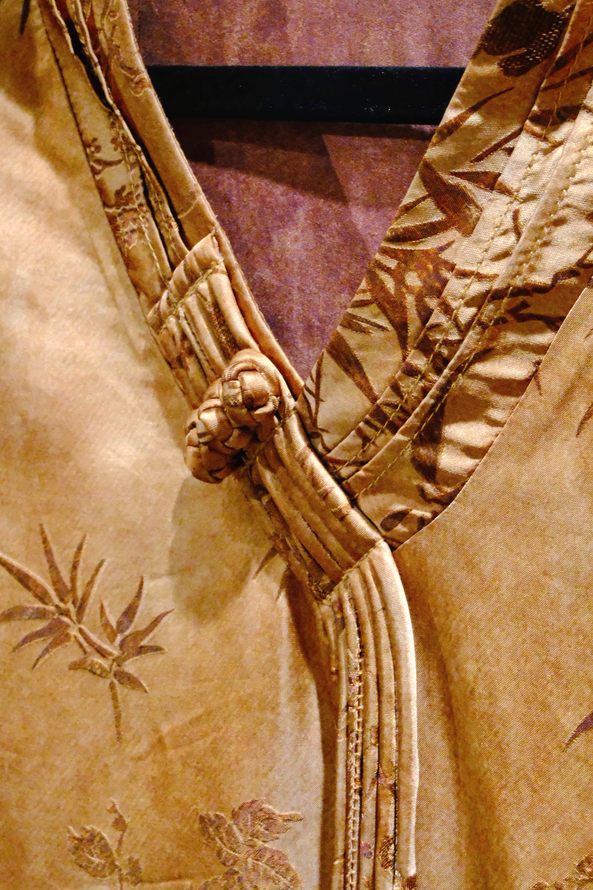 This elegant blouse is made from imported jacquard rayon, designed with a warm vintage gold tone and intricate woven bamboo motifs. The fabric has a gentle sheen and smooth drape, giving the piece an elevated and timeless New Chinese character.