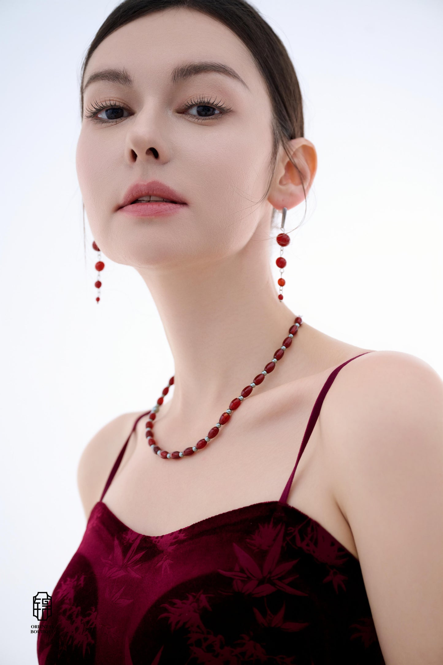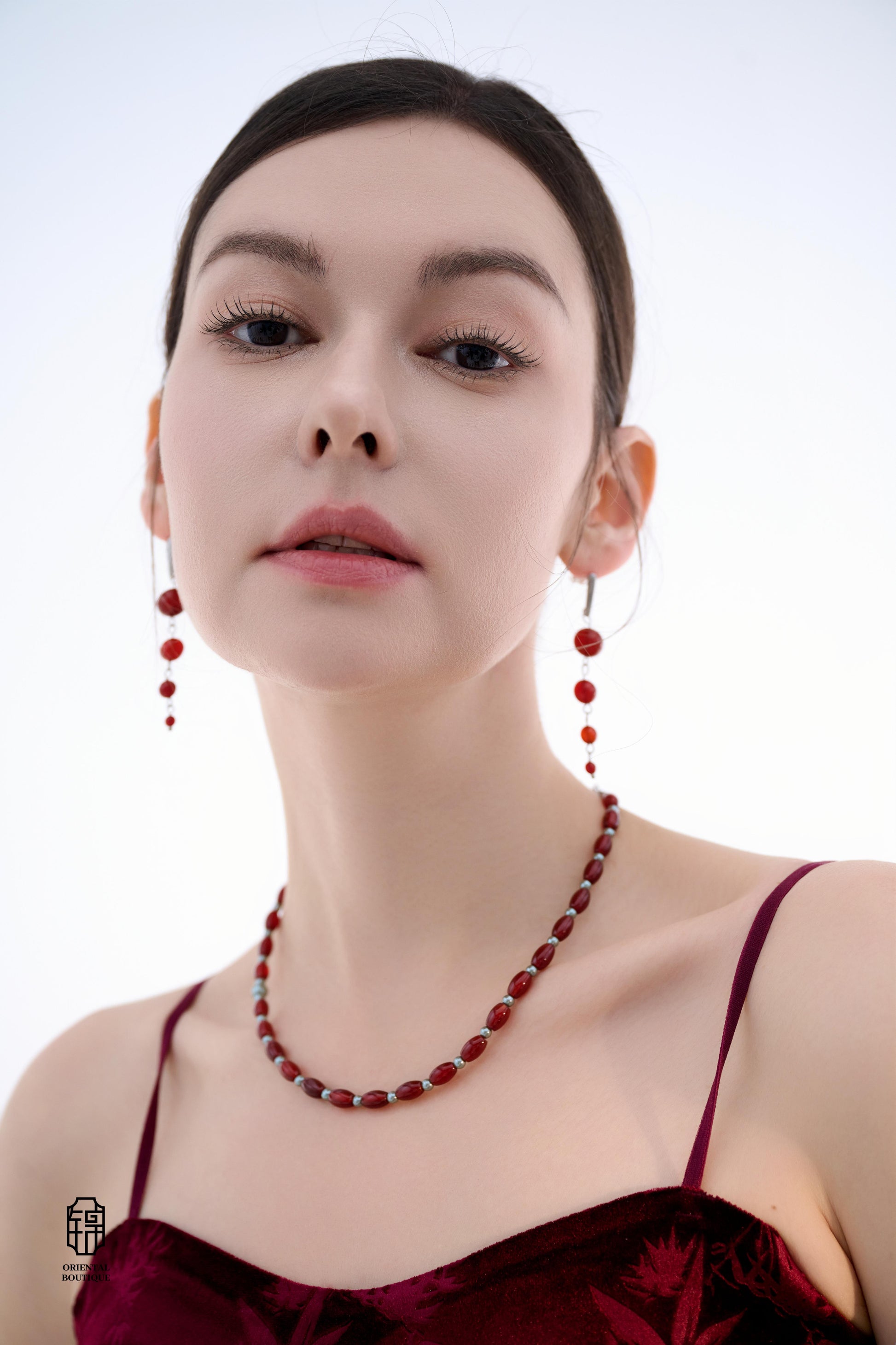 These earrings are composed of a string of red beads, simple yet full of sentiment, resembling the traditional "red beans" that symbolize longing and affection. The beads gradually decrease in size, creating a natural cascading effect that rests gently at the ear, whispering with elegance. The silver accents enhance the vibrancy of the red, making the overall design clean and refined. Ideal for daily wear or special occasions, these earrings carry the subtle charm of Eastern aesthetics, as if bearing a message of deep affection, reminiscent of the poetic symbolism of red beans.
